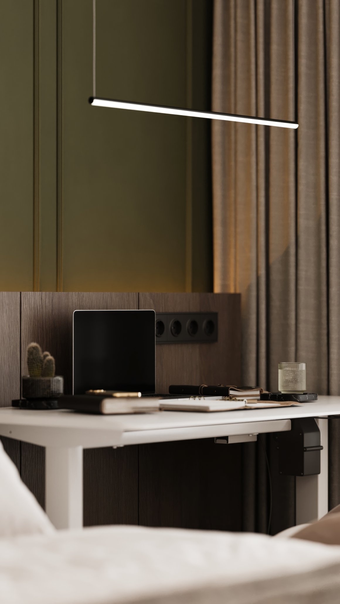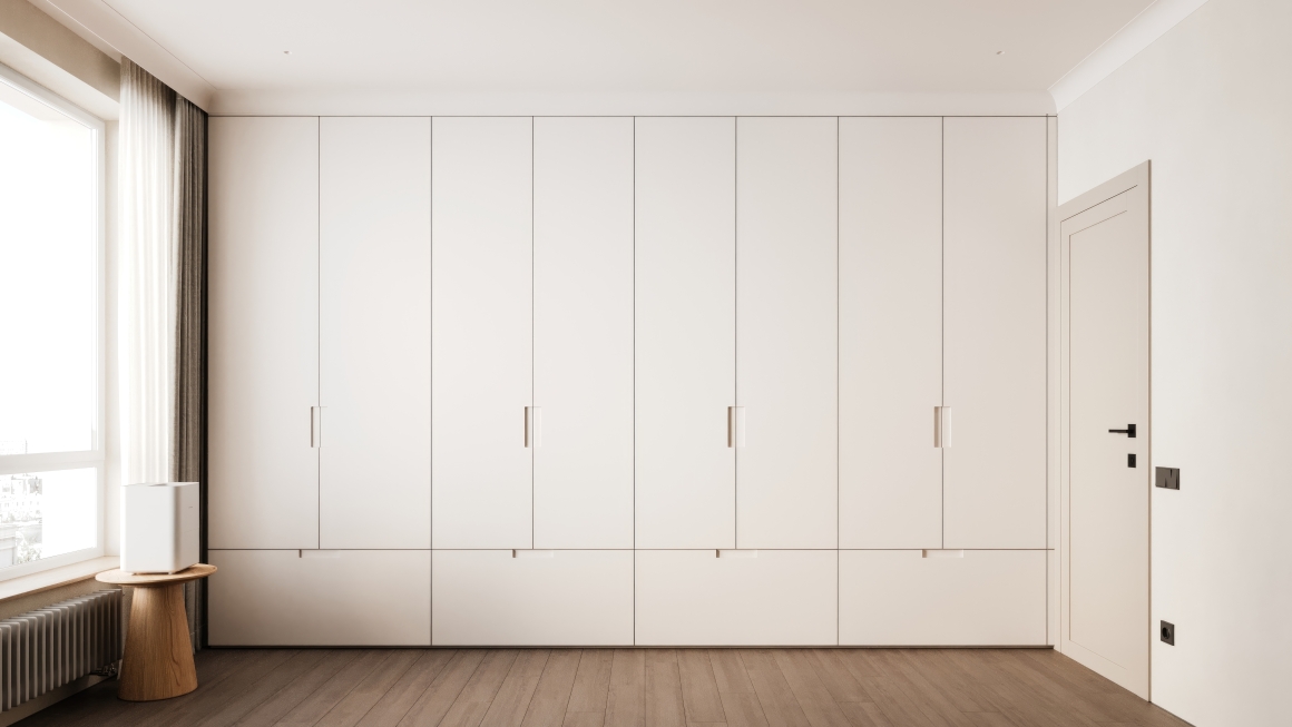 Доминантой пространства выступает безупречная монолитная система хранения — не просто функциональная мебель, а архитектурная плоскость, чей матовый финиш и ритмичный шаг фасадов задают вектор всему интерьеру. В дуэте с благородным оливковым оттенком стен и глубокой текстурой дерева этот ансамбль создает диалог между строгим минимализмом и живой природой, между чистотой линий и обволакивающим уютом