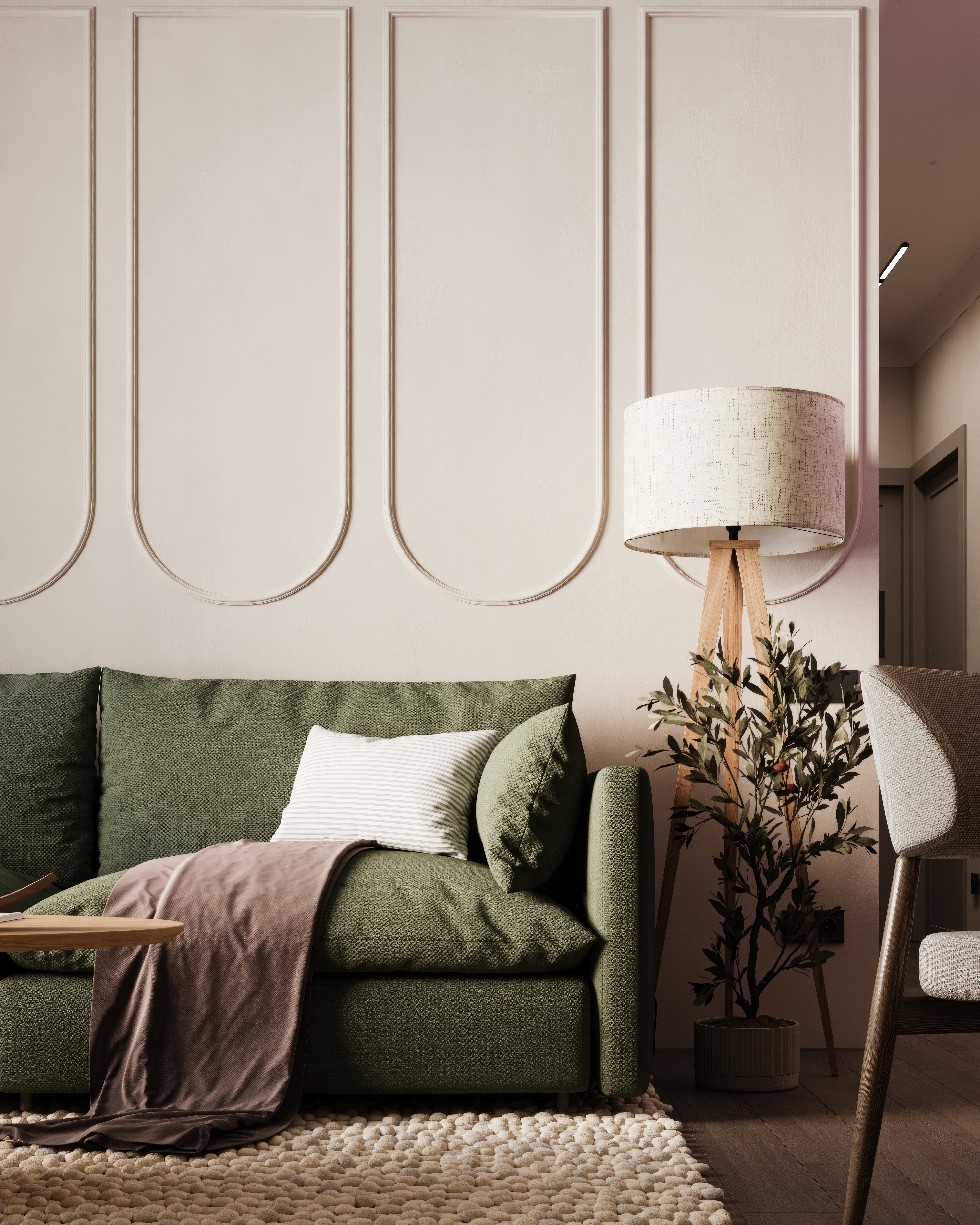 Этот проект переосмысляет понятие современного уюта, доказывая, что пластичные формы и мягкая природная гамма способны создать интерьер невероятной глубины. Мы создали пространство-объятие, где скругленные силуэты мебели и стен гармонично соседствуют с благородным деревом и освежающими акцентами шалфея.
