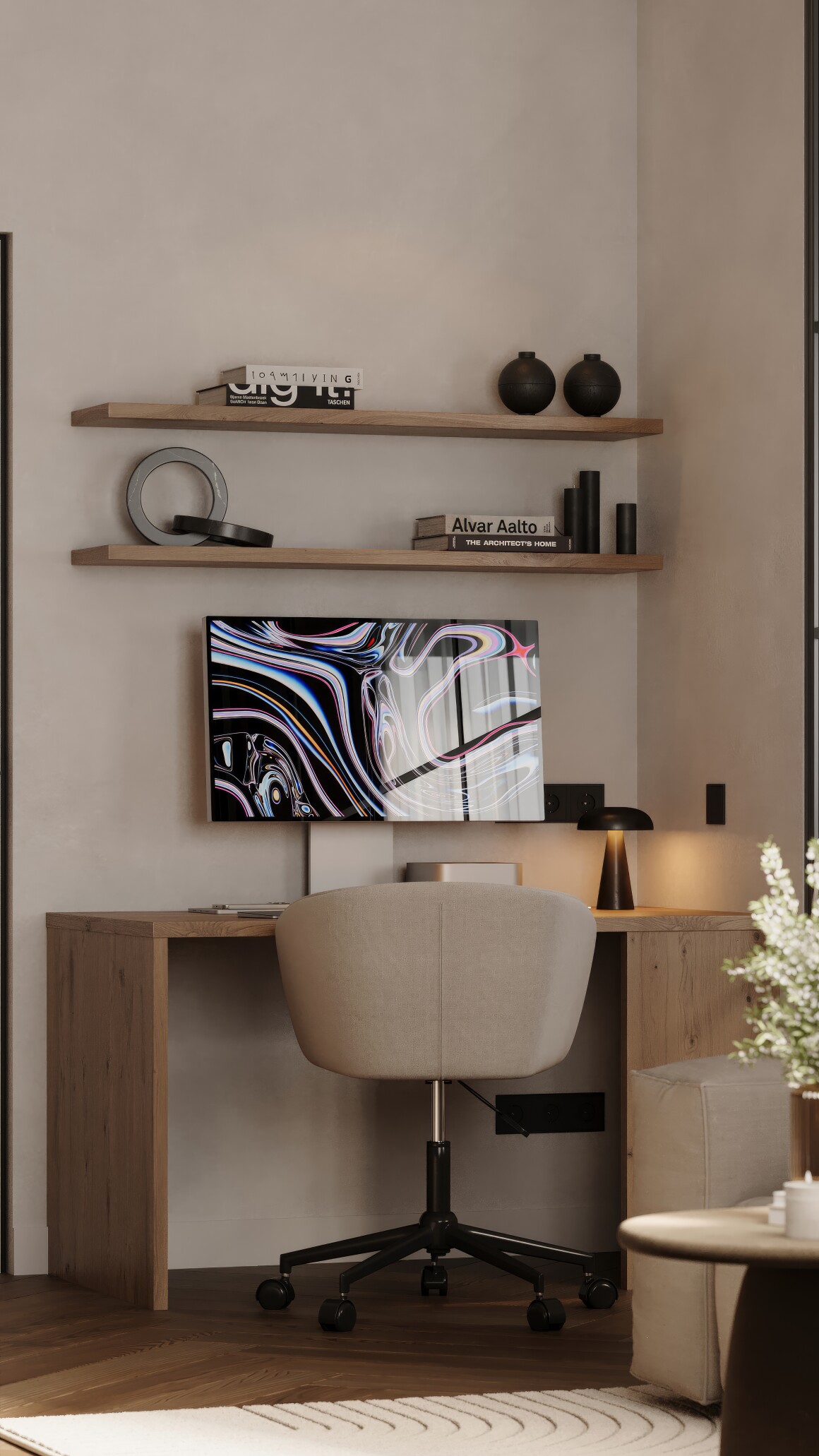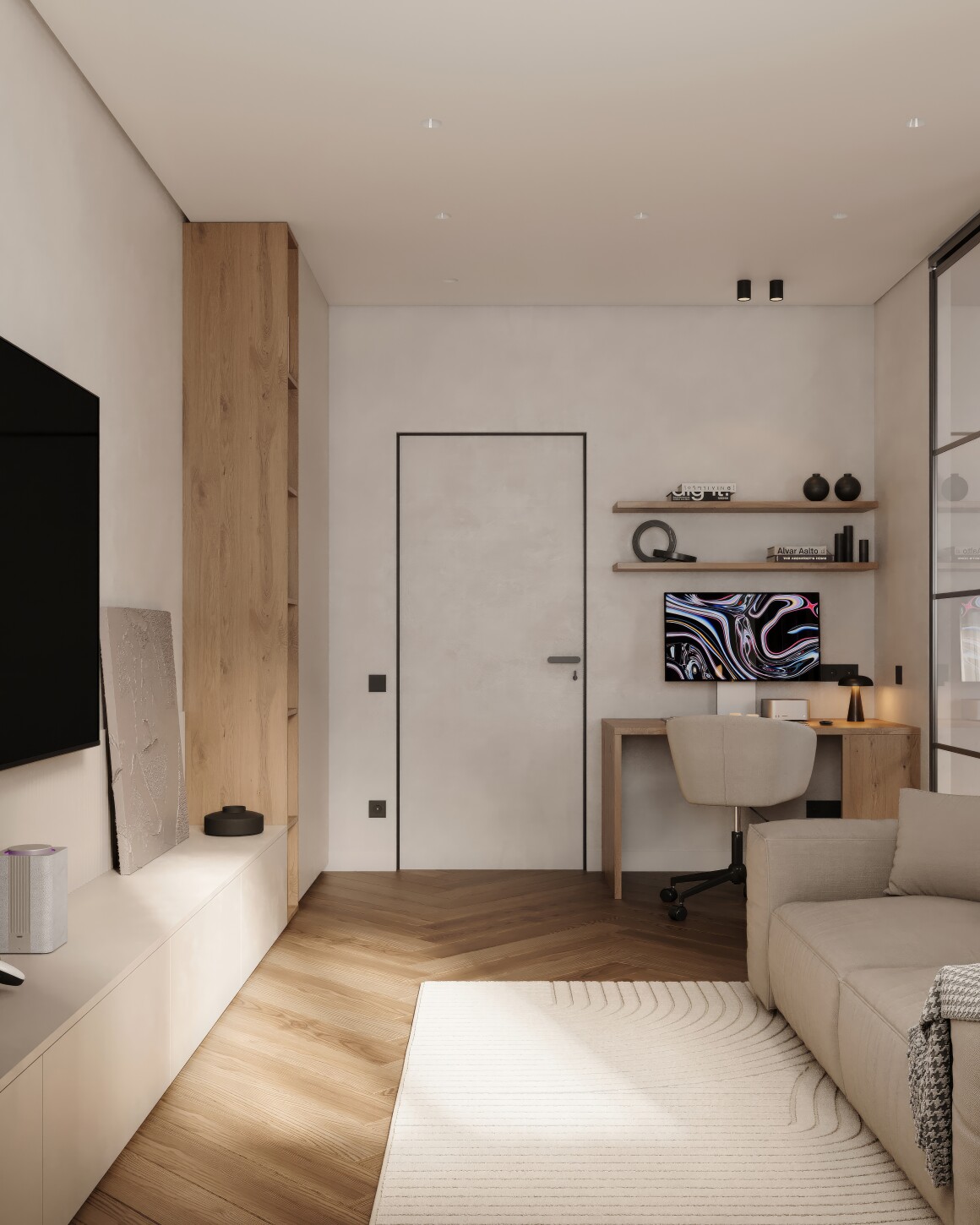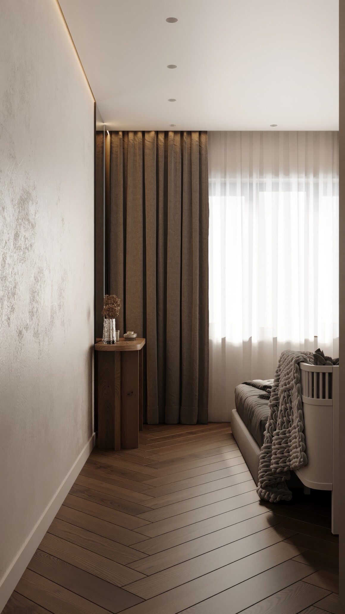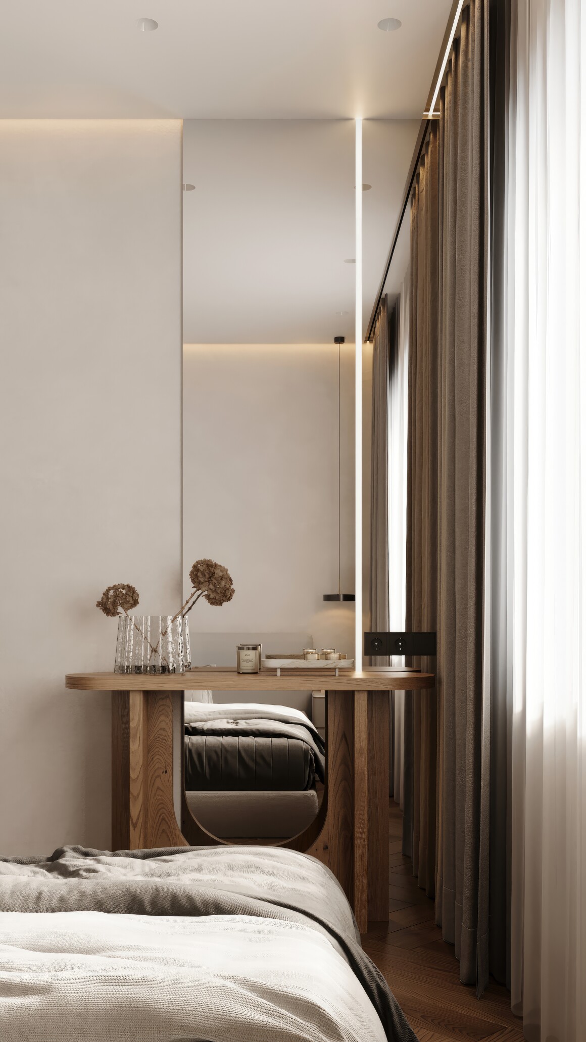 Этот интерьер — воплощение философии, где простота становится высшей степенью изысканности. Мы создали не просто жилое пространство, а тактильный портрет своей хозяйки, где каждая линия дышит гармонией, а каждый оттенок говорит на языке утонченной женственности.